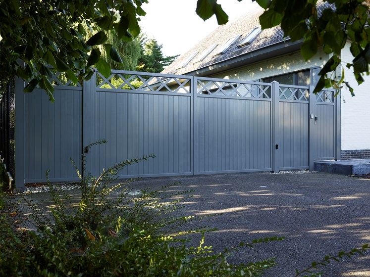 De Sofia-vleugelpoort bestaat uit aluminium tandgroefprofielen als onderkant, en een stalen kruisverdeling als bovenkant. Dit zorgt voor een mooie combinatie van klassieke en moderne elementen.